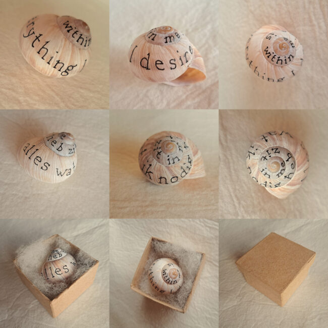 De kleinste troostrijke ruimte die ik tot nu toe heb gemaakt: Een handgeschreven boodschap op een slakkenhuis. Ik vind de lege slakkenhuizen in de duinen, maak ze schoon en beschrijf ze met de volgende zin: ‘alles wat ik nodig heb zit in me’. Duurzaam verpakt in schapenwol en kartonnen doosje: € 22,50 excl verzendkosten (bestellen…